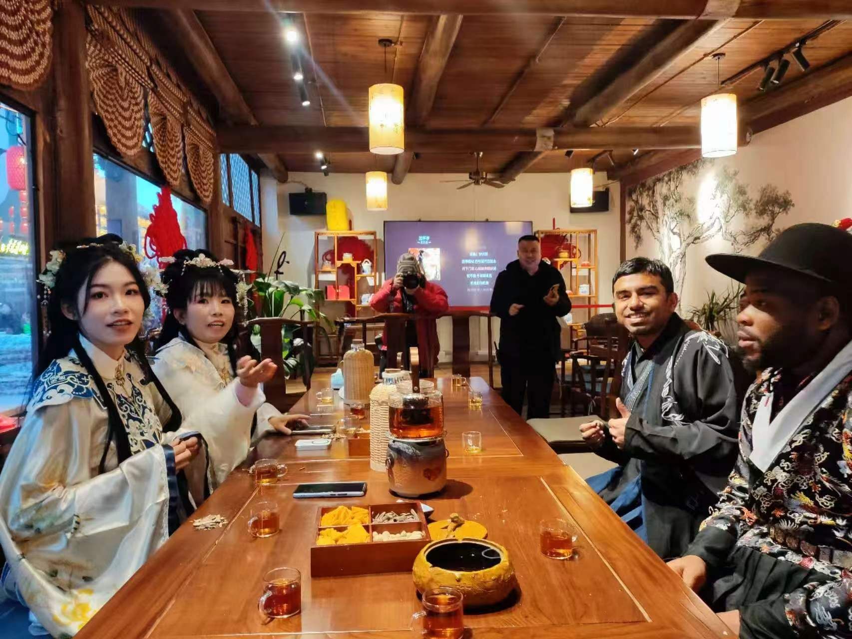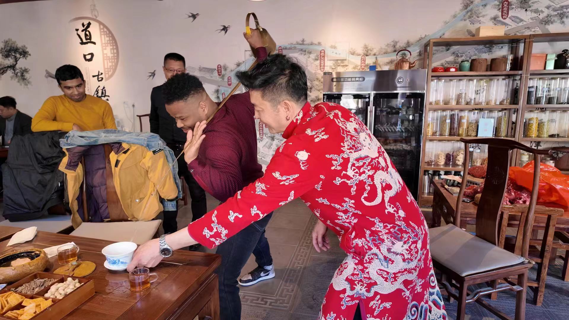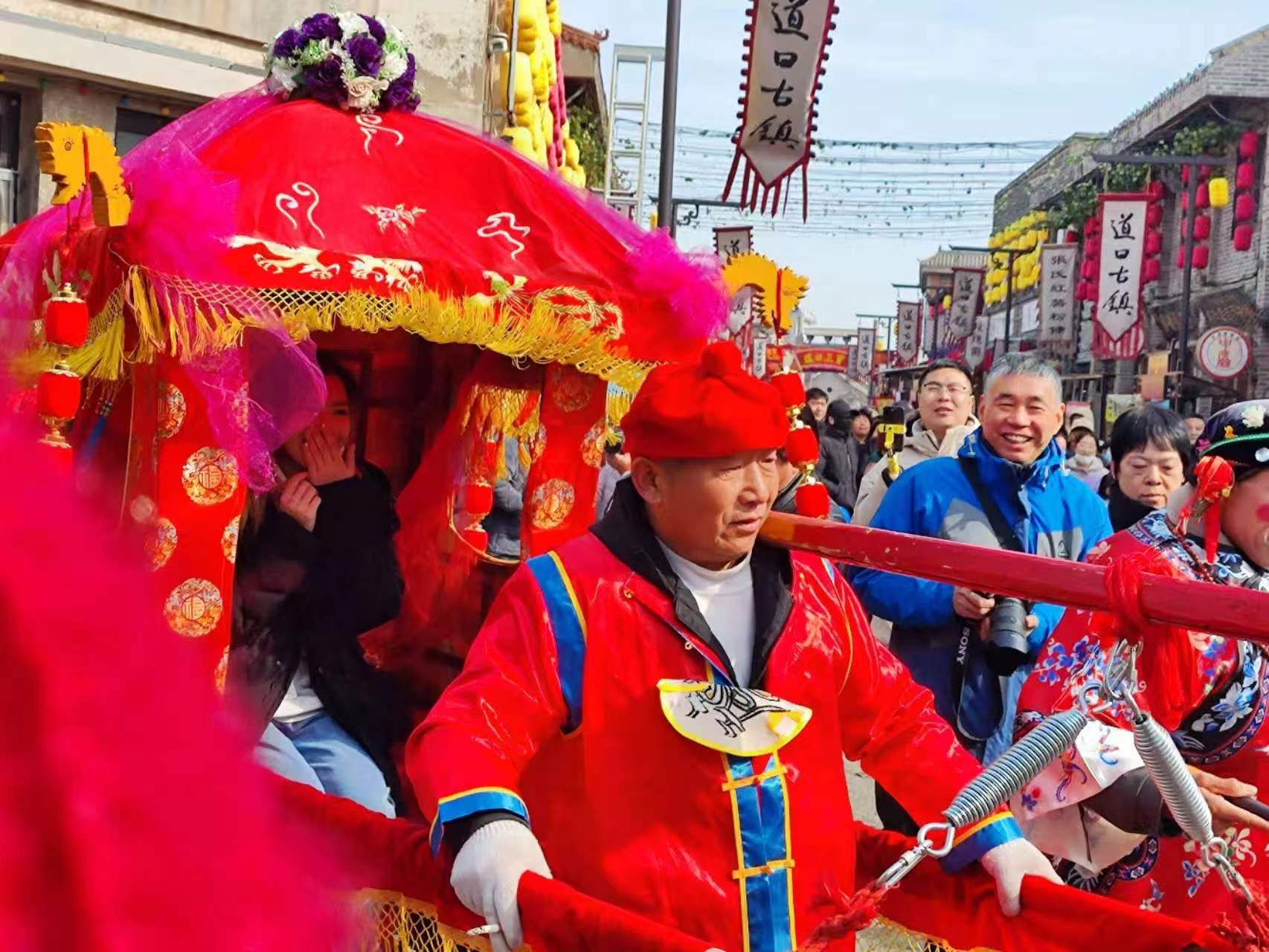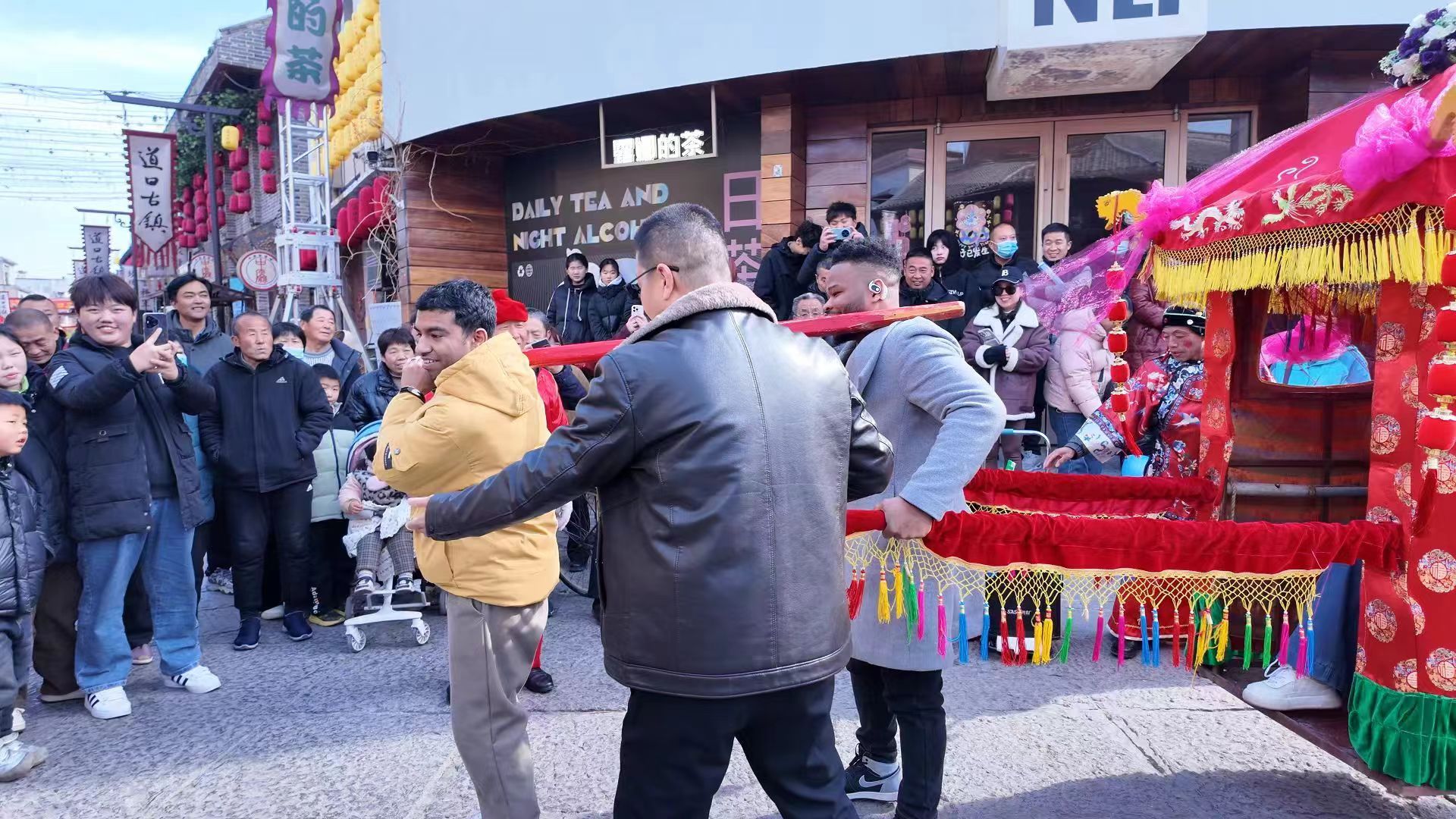 滑县古庙会作为豫北地区最具代表性的春节活动之一,以其浓厚的年味和丰富的民俗表演吸引了众多游客。同学们一进入庙会现场,便被热闹的氛围所感染。庙会上,舞狮、高跷、秧歌等传统表演轮番上演,展现了豫北地区独特的文化魅力。同学们身着汉服,沉浸式体验中国传统文化。尼日利亚员工恩泽和孟加拉国员工塔里克在非遗传承人的帮助下,腿绑高跷在古镇小路上体验了踩高跷,手握茶壶有模有样地表演功夫茶,还化身轿夫,体验了抬花轿的乐趣。塔里克兴奋地表示:“这是我第一次看到如此热闹的表演,中国的文化真是太有趣了!”泰国员工幕亦瑶和缅甸员工蔡婷也坐上大花轿,沉浸式体验中国传统婚俗的热闹与喜庆。